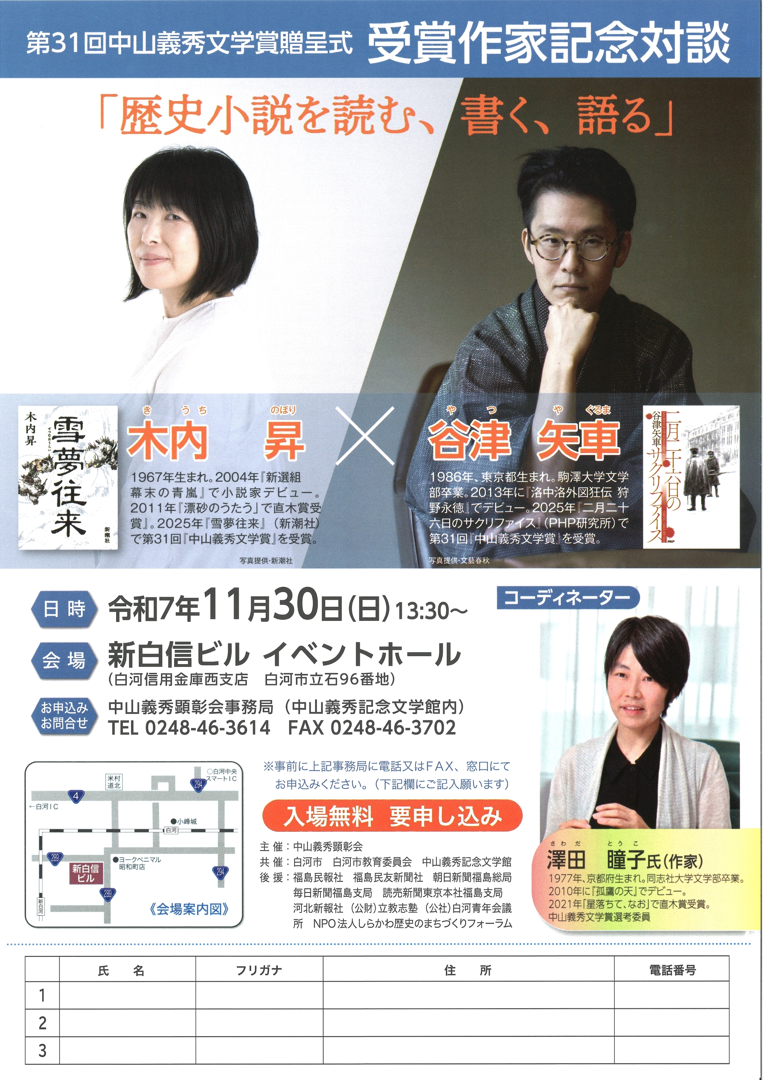 第31回中山義秀文学賞贈呈式・受賞者記念対談 「第31回中山義秀文学賞贈呈式・受賞者記念対談」観覧者募集!●日時:11月30日(日) 13時30分から(開場 12時45分)●会場:新白信ビル イベントホール(立石96番地) ※入場無料/当日入場可●主催:中山義秀顕彰会 TEL:0248-46-3614