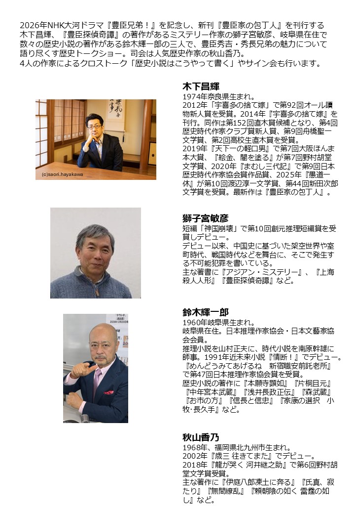 2026年NHK大河ドラマ『豊臣兄弟!』を記念し、新刊『豊臣家の包丁人』を刊行する木下昌輝、『豊臣探偵奇譚』の著作があるミステリー作家の獅子宮敏彦、岐阜県在住で数々の歴史小説の著作がある鈴木輝一郎の三人で、豊臣秀吉・秀長兄弟の魅力について語り尽くす歴史トークショー。