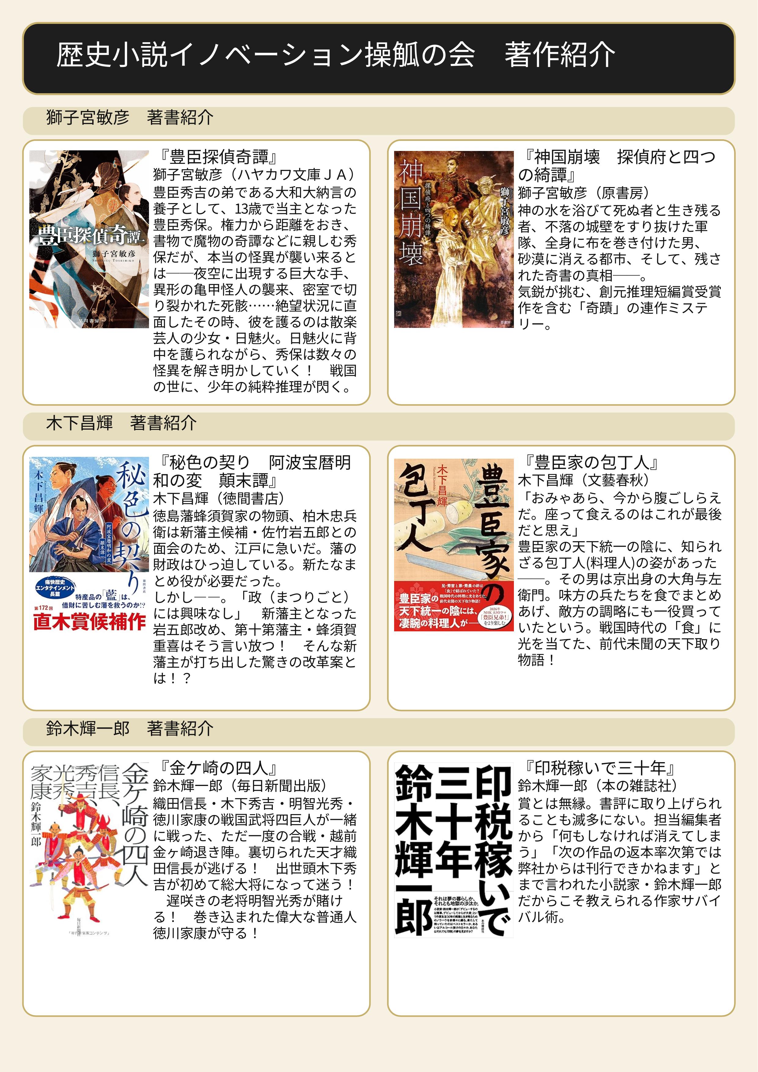 4人の作家によるクロストーク「歴史小説はこうやって書く」やサイン会も行います。4名の作家の既作品をご持参くだされば、サインを入れさせていただきます。また、書籍の販売もあります。